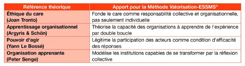 La Méthode Valorisation-ESSMS® n'est pas empirique au sens intuitif du terme : elle s'inscrit dans un corpus théorique reconnu qui lui confère sa robustesse conceptuelle. Elle se situe ainsi à la croisée de plusieurs courants théoriques : management et pilotage institutionnel, organisations apprenantes (analyse collective des pratiques), et éthique du care (attention portée aux situations, participation des personnes accompagnées et des professionnels).