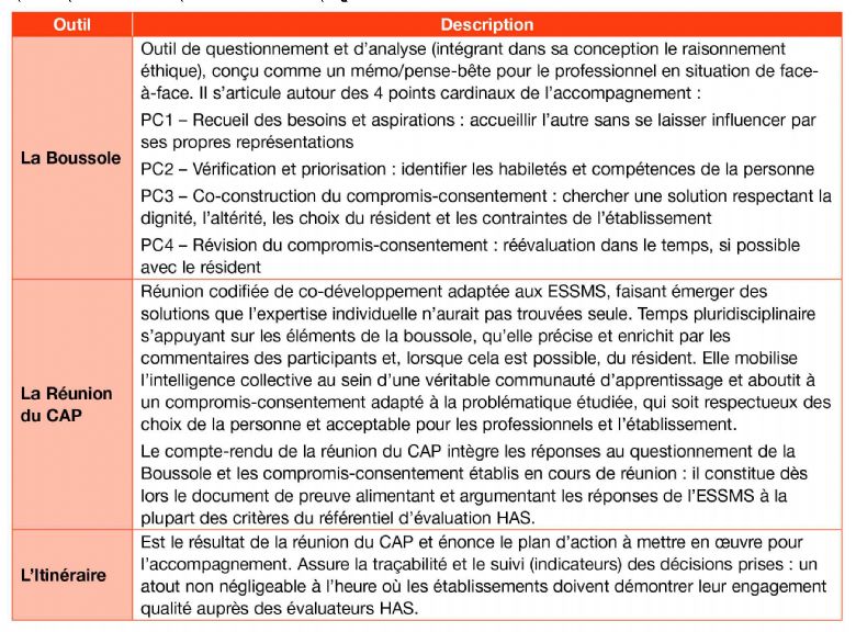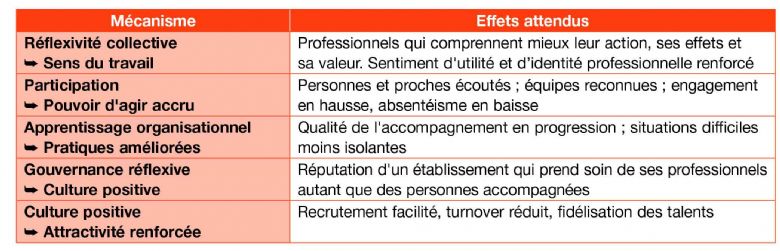 L'articulation avec les dispositifs existants : la méthode s'intègre dans l'écosystème institutionnel (projet d'établissement, évaluations, DUERP, politique qualité, projet personnalisé d'accompagnement) plutôt qu'elle ne s'y ajoute.